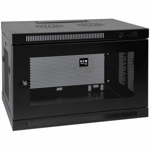 The SRW9U SmartRack 9U Low-Profile Switch-Depth Wall-Mount Rack Enclosure Cabinet is designed to house EIA-standard 19-inch rack equipment in network wiring closets, retail locations, classrooms, back offices and other areas with limited floor space where you need equipment to be secure, organized and out of the way. Constructed from heavy-duty steel with a durable black powder-coated finish, the cabinet has a maximum load capacity of 200 pounds.The side panels and front door lock securely to help prevent damage, tampering or theft. The front, top, bottom and removable side panels are vented, which allows air to flow freely and keep equipment cool. The reversible front door can open left or right by rotating the cabinet 180° before mounting. Convenient top and bottom ports allow easy cable routing. The SRW9U comes fully assembled and ready to mount to the wall, or use Tripp Lite's optional SRCASTER rolling caster kit to make it a mobile rack. Square and threaded mounting holes and numbered rack spaces make equipment installation easy. The vertical mounting rails adjust in 7/8-inch increments to accommodate equipment up to 16.5 inches deep, such as network switches and patch panels.