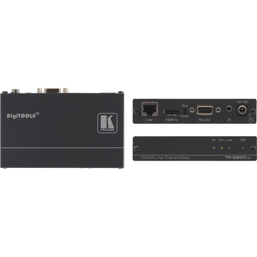 The TP-580TXR is an extended range, HDBaseT twisted pair transmitter for HDMI, bidirectional RS-232 and IR signals. The TP-580TXR inputs HDMI, RS-232, and IR signals and converts them into an HDBaseT twisted pair signal that it transmits to a TP-580RXR receiver.