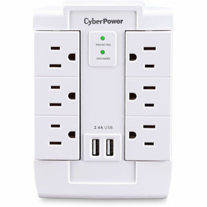 The CyberPower Professional Series CSP600WSURC2 Surge Protector is ideal for Home/Office protection with 1500 joules, 6 swivel outlets, 2 USB charge ports (2.4 Amps shared), and a convenient wall tap design. The surge protector is ideal for protecting personal computers, phones/fax/modems, printers, stereos, and other electronics. Its two USB are perfect for keeping tablets, smart phones, and other rechargeable electronics ready to use.