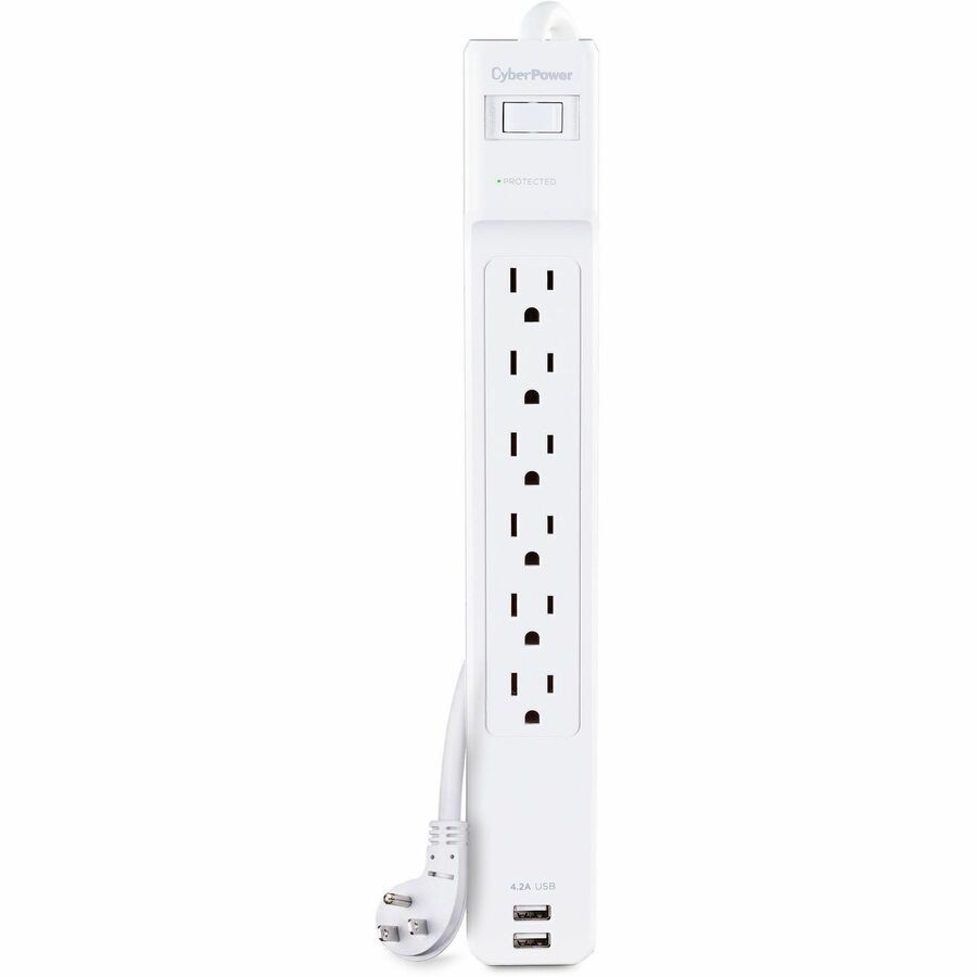 The CSP606U42A Professional Surge Protector from CyberPower offers vital surge suppression for common home and office devices such as computers and electronics. It is designed to provide maximum protection and convenience to a number of devices where wall receptacles are out of reach. The CSP606U42A prevents damaging spikes in energy caused by storms and electrical power from reaching your electronc equipment. It provides 900 joules of protection, 6 outlets (1 widely spaced for a transformer plug), 2 USB charging ports, and a low profile right-angle, 6-foot braided power cord. Features of the CSP606U42A include safe-fail notification, Microdot LED protected indicator light, and a 15A Power Breaker Switch. The two USB charging ports with 4.2-amp total output are located at the end of the Professional Surge Protector, offering the best possible reach.