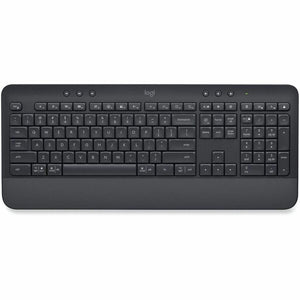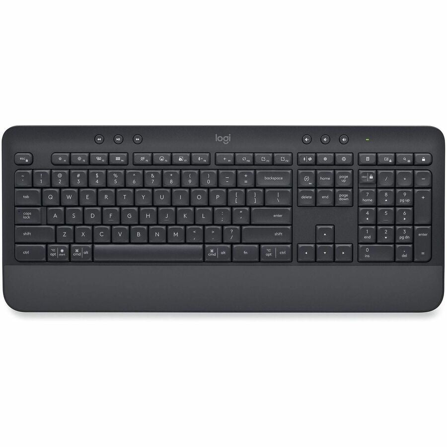 Type in comfort and get more done with the Logitech Signature K650 Wireless Comfort Keyboard. Featuring a built-in soft-touch palm rest and deep-cushioned keys, this comfortable keyboard lets you type with ease all day long. The adjustable feet offer two different tilt angles so you can customize your typing position, and the full-size keyboard layout provides convenient access to all the right keys. Logitech's upgraded shortcut keyboard helps you save time with 24 different commands including mic mute and unmute, screenshot, and web navigation. Designed for versatility, it offers two different wireless options for connecting to your computer: Bluetooth or the included Logi Bolt USB receiver. Powered by 2 AA batteries that will last up to 36 months, this wireless computer keyboard is also compatible with multiple operating systems, including Windows, Mac and Chrome. Reliable and hassle-free, it's an easy-to-clean, spill-resistant work keyboard. Upgrade to better productivity and more flexibility by combining your wireless Logitech keyboard with the Signature M650 mouse and downloading the Logi Options+ Software App to personalize your experience.