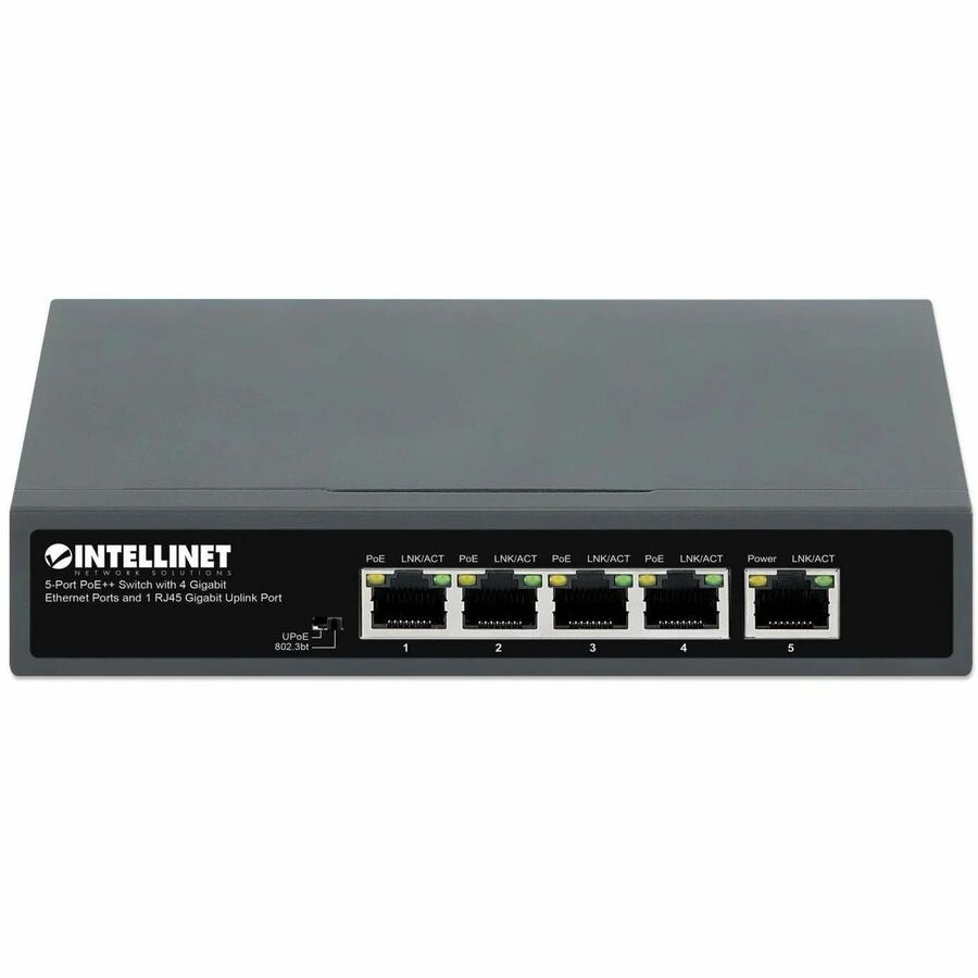 The 5-Port PoE++ Switch with 4 Gigabit Ethernet Ports and 1 RJ45 Gigabit Uplink Port from Intellinet Network Solutions is the extra-powerful choice for small businesses. Four 10/100/1000BASE-T 4PPoE (PoE++) ports deliver up to 90 watts to even the most power-hungry devices like Thin Clients, POS systems or PTZ speed dome cameras. Any IEEE802.3bt/at/af-compliant device attached to the switch PoE ports requires no additional power, which avoids the time and expense of electrical rewiring and reduces the clutter from power supplies and adapters on ceilings and walls. Any mix of PoE and non-PoE devices is supported, and thanks to its short circuit, overload and high-voltage protection function, your equipment is well-protected.
