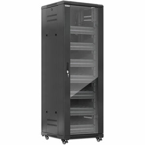 Our package contents don't end with the rack and fans. On the seven included shelves, you can place equipment that is not rack-mountable. Seven vented blank panels cover unused space in the cabinet. Four wheels offer ease of mobility around your office or server room. Once the enclosure is in place, you can stabilize it using the built-in leveling feet. To mount your 19" equipment, you don't even need to purchase mounting material because 40 #10-32 screws are also included.