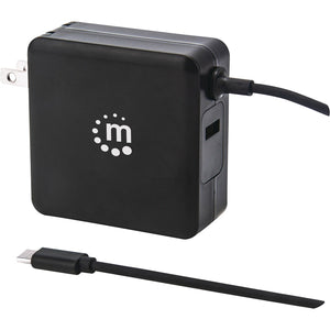 Manhattan Wall/Power Charger (Euro 2-pin), USB-C and USB-A ports, USB-C Output: 60W / 3A, USB-A Output: 2.4A, USB-C 1m Cable Built In, Black, Three Year Warranty, Box