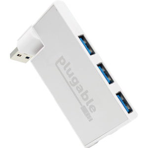 The Plugable Bus-Powered 4-Port Rotating USB 3.0 Hub (USB3-HUB4R) is a portable USB 3.0 travel hub that enables connecting four low-power USB 3.0 devices on a single USB 3.0 port. The hub features a unique 180 degree rotating USB connector to allow convenient placement on a variety of host computers like laptops, tablets, or 2-in-1s. As a bus-powered hub, it's great for USB devices with low power draw like wired keyboards and mice, flash drives, and card readers.